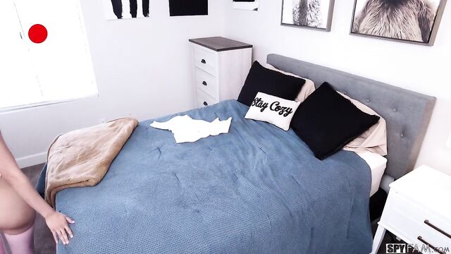 Description: Stepdad catches stepdaughter snooping in his room and masturbating on his bed.