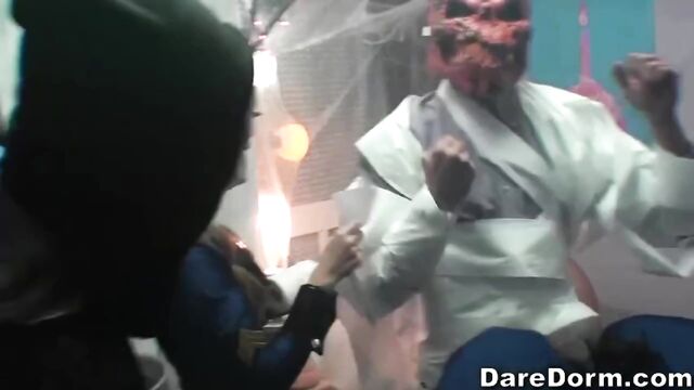 Description: Its that time of year again. The time where girls can dress and act like total sluts and be ok with it. Halloween is here, and this latest daredorm submission was definitely the best halloween party anybody has ever submitted to us. First of all, the dorm room was very small, and they were like twenty people in the room. Butts and tits were rubbing against each other. One hottie had a sexy bad cop costume, and she totally lived up to her name. She started blowing the ninjas cock with such gusto, that the ninja couldn't hold it any longer and fucked the hell out of her. Meanwhile the rest were showing tits, licking and blowing cocks and many many more tricks and treats.