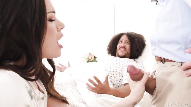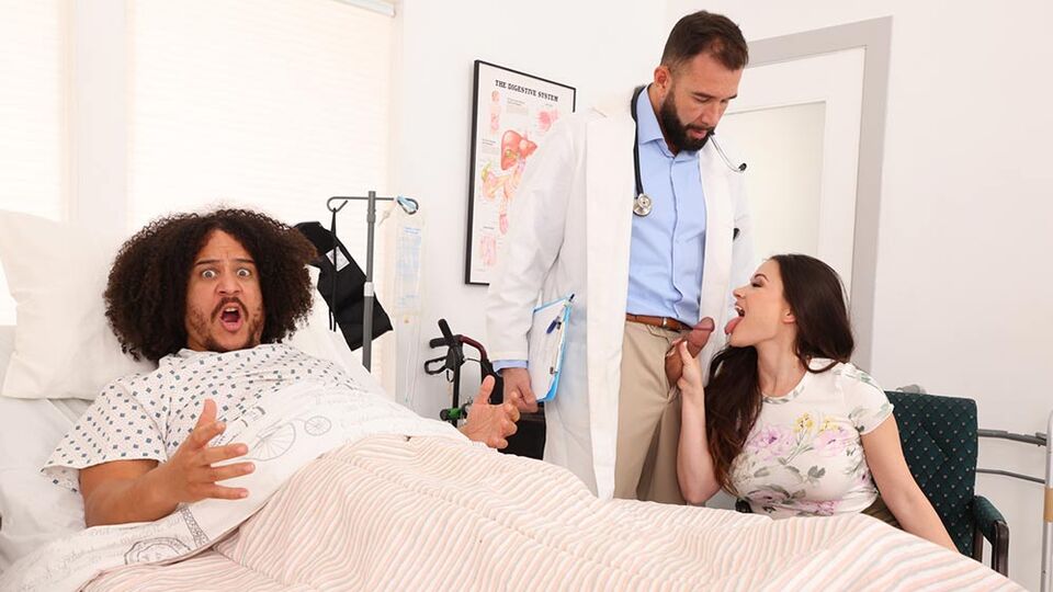 Description: Alison Rey's boyfriend, Bison, has been trying all kinds of tactics to boost his lacking libido. Unfortunately, for him... his latest attempt has wound him up in the hospital. It turns out that Bison was trying to down some oysters but one of them ended up having a pearl in it, causing him to choke. Alison tries to be supportive, but she can't help but feel that Bison's quest for upgraded libido is futile. After all, it's not like he's sporting a big package to begin with...Things get even worse, however, when Bison's doctor Will Pounder informs him that he'll have to refrain from any strenuous activity while he heals- including sex! Alison's annoyed to hear this... even if Bison has problems getting hard, it would suck to go long without sex. Luckily for her, however, Dr. Will is more than ready to give her a pounding right then and there, which will be more than enough to tide her over for a while. Bison can only watch from the bed as he gets cucked by his own doctor while his girlfriend loves every second of it. Oh well, better eat more oysters Bison!