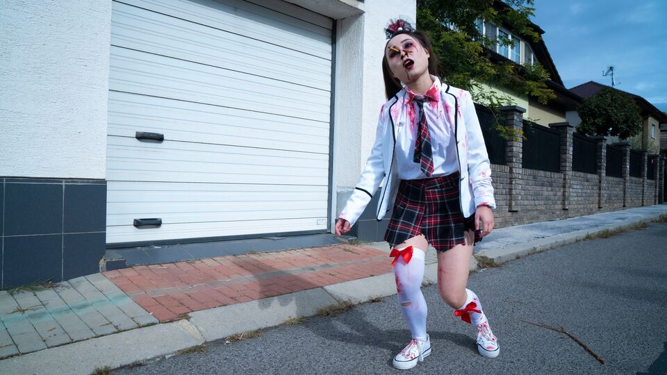 Description: Ricky Rascal and Nick Ross are playing video games in the garage when they hear shambling outside. Checking the door, they see an Asian stunner dressed as a schoolgirl... with a pencil sticking through her nose! They tell her to scram and go back to their game, but the moaning walker enters the house. When Ricky goes to refill his beverage, the zombie teen bites Nick, and when Ricky comes back to fend her off, he gets a bite for his trouble too! Now that they're all zombies, Yiming craves more flesh, so she gets on the couch, pulls up her skirt, and spanks her ass enticingly. Nick and Ricky shamble over and take their dicks out, and Yiming sucks them both off at the same time. Taking turns fucking her tight pussy and pretty face, Nick and Ricky cover Yiming in cum, then go back to their game... before they turn!