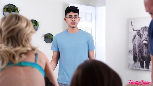 Description: What would happen if four families each contributed one member to create a new family? In this episode of Family Swap, Katheryn Mae wakes up and realizes when the rest of her swap family pours in that it's Mother's Day. Jade gives her swap mom a card and a gift of lingerie. Clarke Kent got his swap wife a vibrator. Diego Perez is just along for the ride.Later, Diego can't find his swap family. Clarke is balls deep in Jade while Kathryn wears her new lingerie and presses her new toy to her clit. When Diego walks in on the trio, Kathryn has him join in. Soon she's sucking his dick while Jade slurps Clarke's.Returning to the bed, Clarke lays down so Jade can ride him in reverse cowgirl as Diego bangs Kathryn in doggy. The girls swap partners so Jade can splay out for Diego while Kathryn does the same for Clarke. Then, swapping back, Jade lets Clarke spoon with her as Diego enjoys a reverse cowgirl ride from Kathryn. Laying back, the ladies wait to each be covered with cum from their partner, then exchange a deep kiss to finish their foursome.