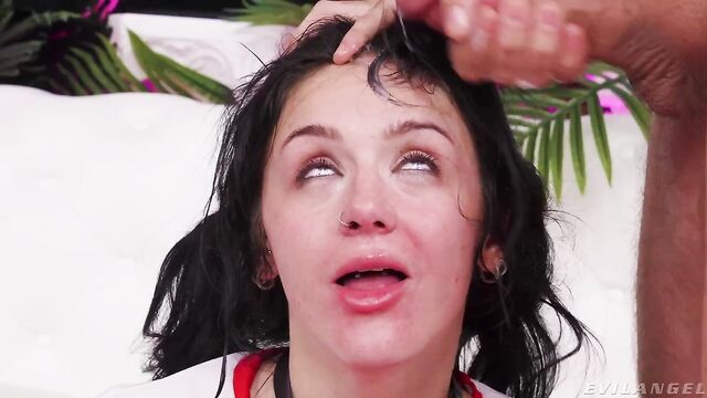 Description:Dark-haired babe Rosalyn Sphinx wears sporty attire: a cropped tee, red shorts, shin pads and sneakers with a transparent backpack. Dominant stud Nade Nasty lifts the petite doll's top and plays with her small tits. He has her choke up spit that she drools onto her chest. Nade spanks her jiggling but cheeks. He spreads her ass and fingers her pussy. Rosalyn sucks his cock. Long strands of sticky spit ooze as he fucks her mouth. She buries his long cock with a deepthroat blowjob. Nade puts her on the floor and slam-fucks her pussy. Rosalyn sucks on a clear dildo while he bones her cunt. The rough sex stud uses his foot to press her face to the floor while pounding the submissive girl's slit. Nade fishhooks her mouth. Rosalyn masturbates with a toy stuffing her gullet! He rails her snatch, pile-driving her into the floor! She gives him a rim job. The action climaxes as Nade soaks the vixen with a massive load that drizzles onto her pretty face.